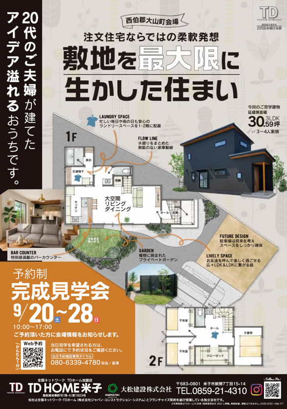 9月20日(土)~28日(日)の9日間、西伯郡大山町にて完全予約制完成見学会を開催いたします!