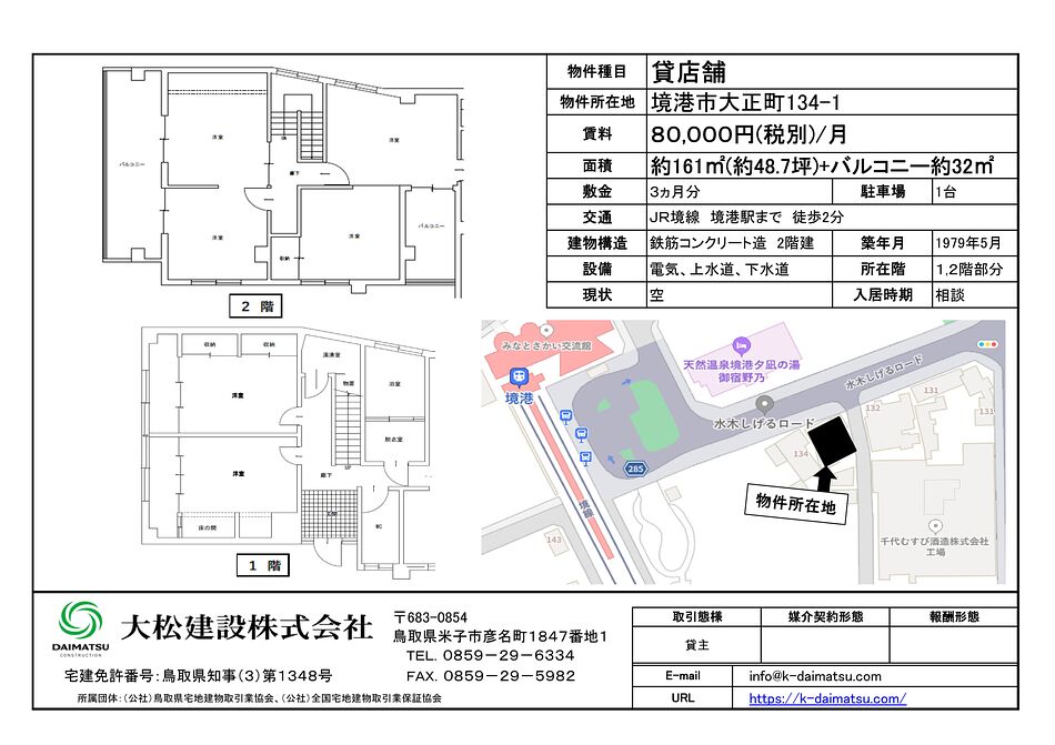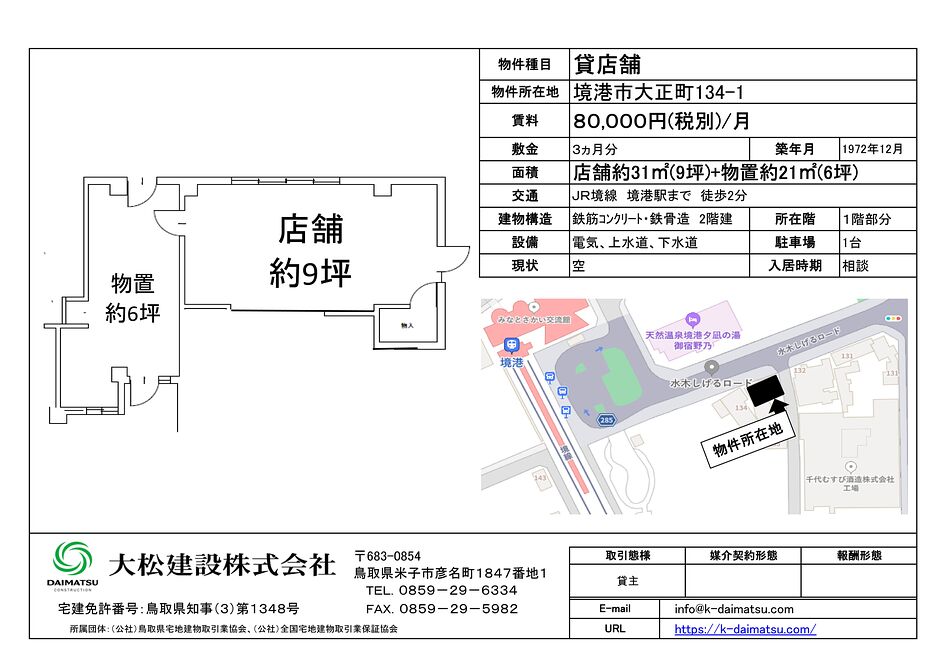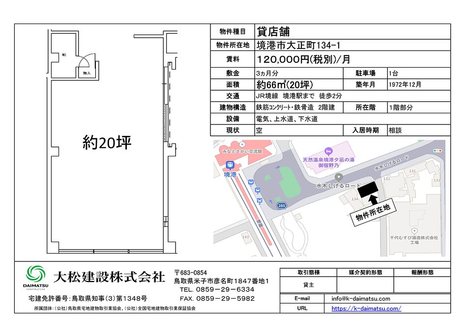 境港市大正町「御宿 野乃」向かい水木しげるロード沿いのテナント募集中です。