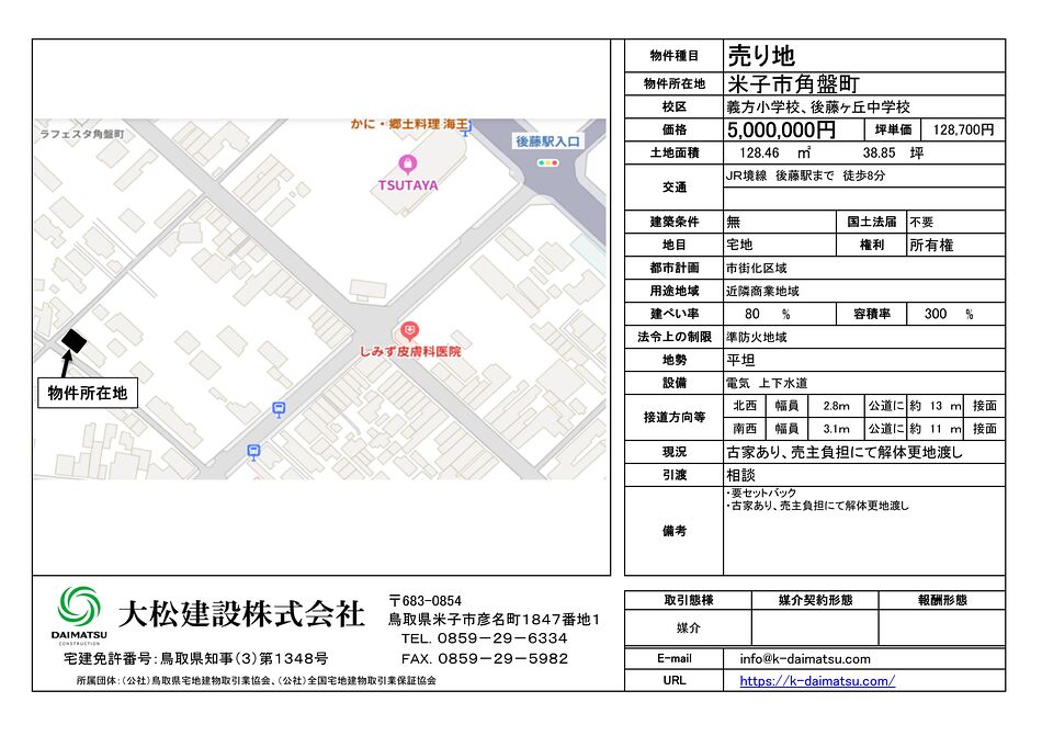 米子市立河崎小学校、加茂中学校校区です分割可能農地法第5条許可申請必要現状有姿にて引渡し