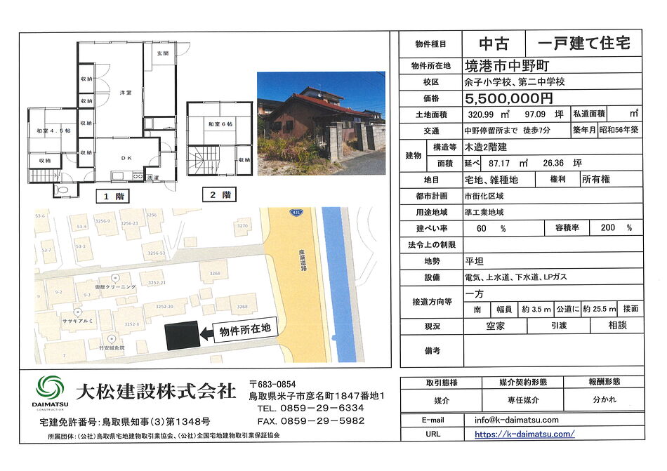 米子市立河崎小学校、加茂中学校校区です分割可能農地法第5条許可申請必要現状有姿にて引渡し