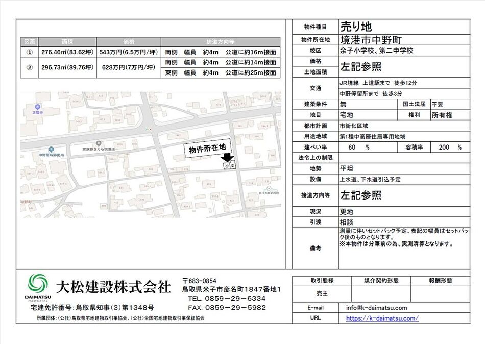 売土地 (120KB) 境港市中野町 543万円~628万円 余子小学校、第二中学校校区です。測量に伴いセットバック予定、表記の幅員はセットバック後のものとなります。※本物件は分筆前の為、実測清算となります。